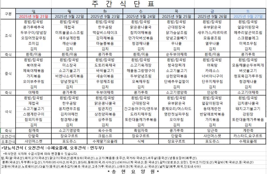 2025년 9월 넷째주 식단표