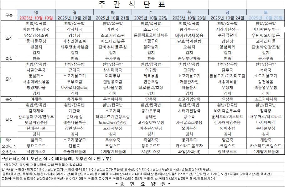 2025년 10월 넷째주 식단표