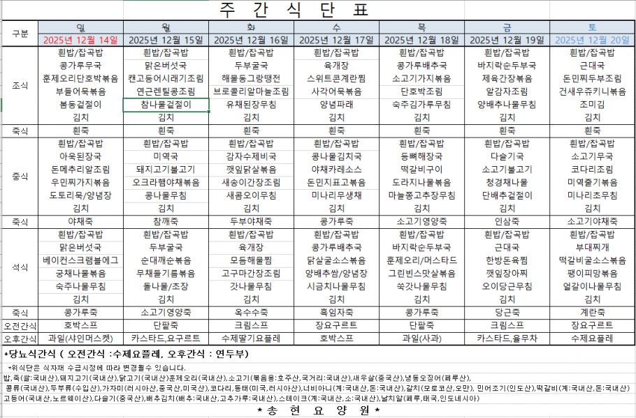 2025년12월 둘째식단표